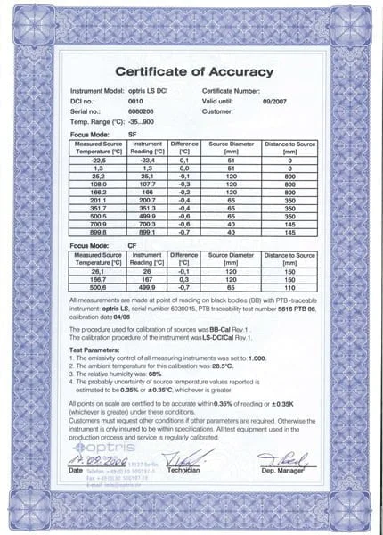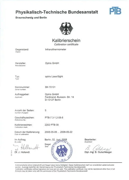 Optris’ reference devices undergo annual inspections by the National Metrology Institute of Germany (Physikalisch Technische Bundesanstalt). This rigorous process guarantees that our temperature measuring devices deliver the highly accurate and reliable results essential for quality control processes. With Optris, you can trust in the precision and consistency of your temperature measurements, ensuring compliance with the highest industry standards.